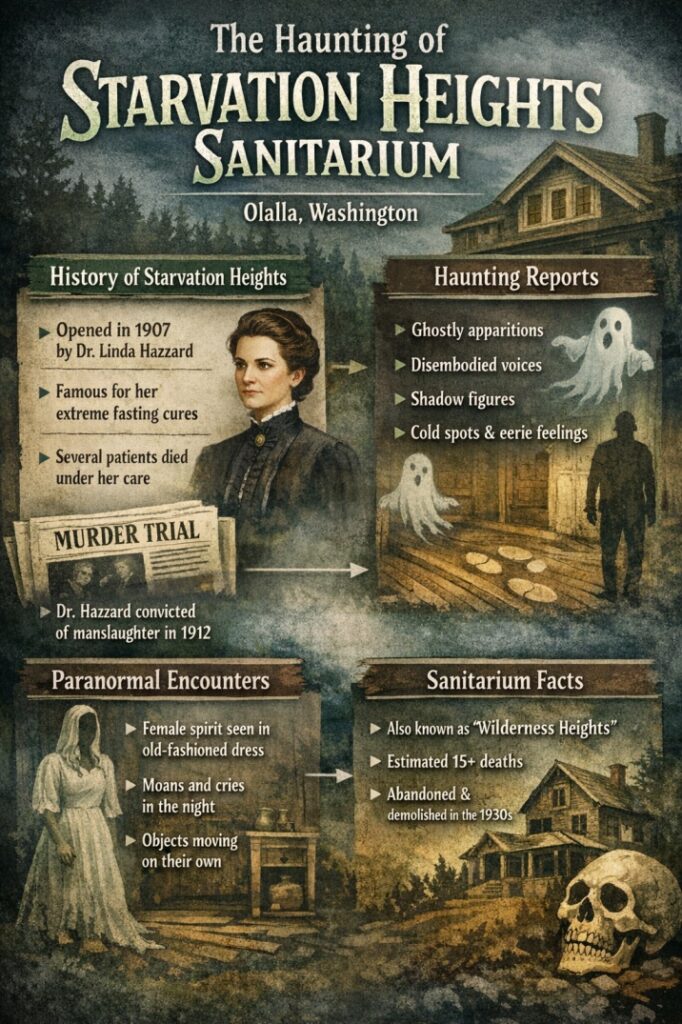 Few places in American haunted history are as disturbing as Starvation Heights because the real story is already horrific before the ghost lore even begins. Long before it became a whispered paranormal legend in Washington state, this Olalla retreat was the center of one of the strangest and cruelest medical crime stories in the Pacific Northwest. The woman behind it, Linda Burfield Hazzard, promoted extreme fasting as a cure for disease, drew wealthy patients into her orbit, and left a trail of deaths, fraud allegations, and lifelong trauma behind her.